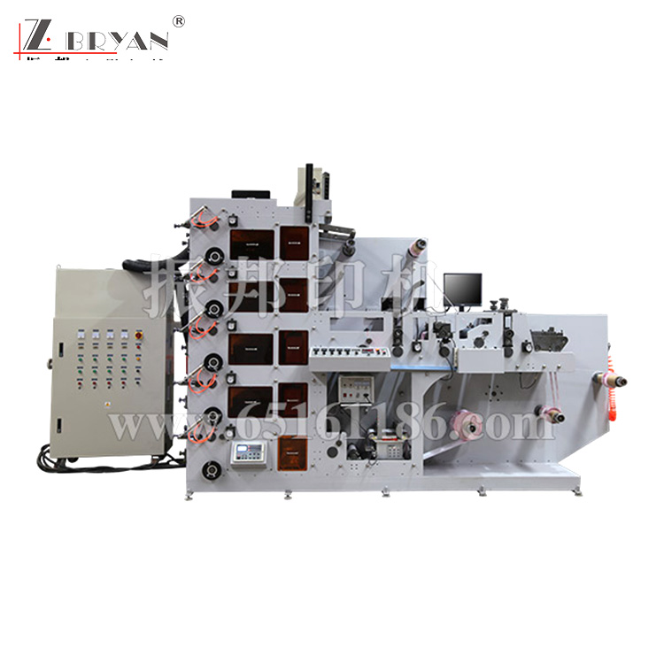 從筒料供紙、印刷、上光、自動(dòng)紅外烘干、覆膜、模切、收卷一次完成。各印刷廠印刷商業(yè)標(biāo)據(jù)、高檔不干膠商標(biāo)**理想的機(jī)型。承印物經(jīng)傳送裝置進(jìn)入采用上、中、下配置的印刷機(jī)組,同時(shí)墨斗輥在墨斗內(nèi)轉(zhuǎn)動(dòng)將油墨傳給網(wǎng)紋傳墨輥,網(wǎng)紋輥的左上方或右下方的刮墨刀刮去網(wǎng)紋輥網(wǎng)墻上的油墨,網(wǎng)紋輥上凹下的墨穴內(nèi)的油墨則傳給印版滾筒,然后在印版滾筒與壓印滾筒之間完成油墨轉(zhuǎn)移,**后經(jīng)過收紙裝置進(jìn)去成印刷品。
